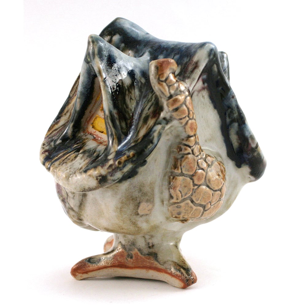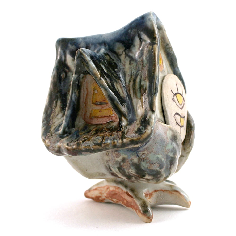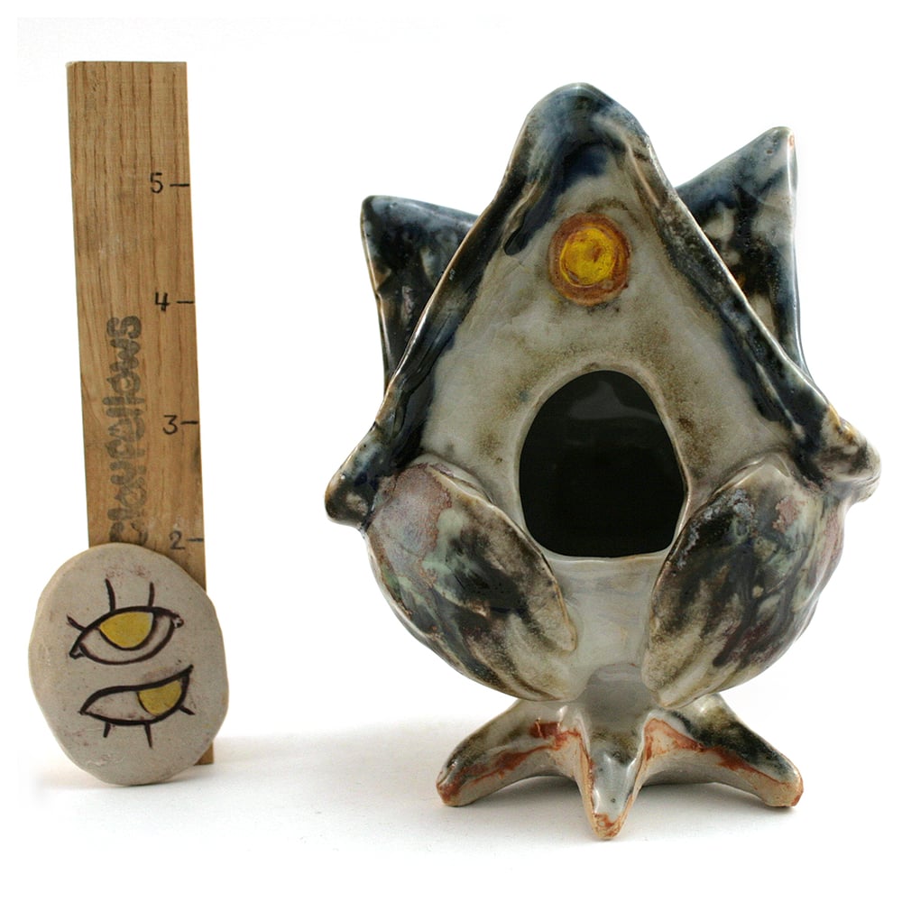 This bird-house hybrid is glazed in a smoky gray base (literally smoky--it's absorbed carbon from the air in the kiln!) with deep blue and dusty purple weathering atop.