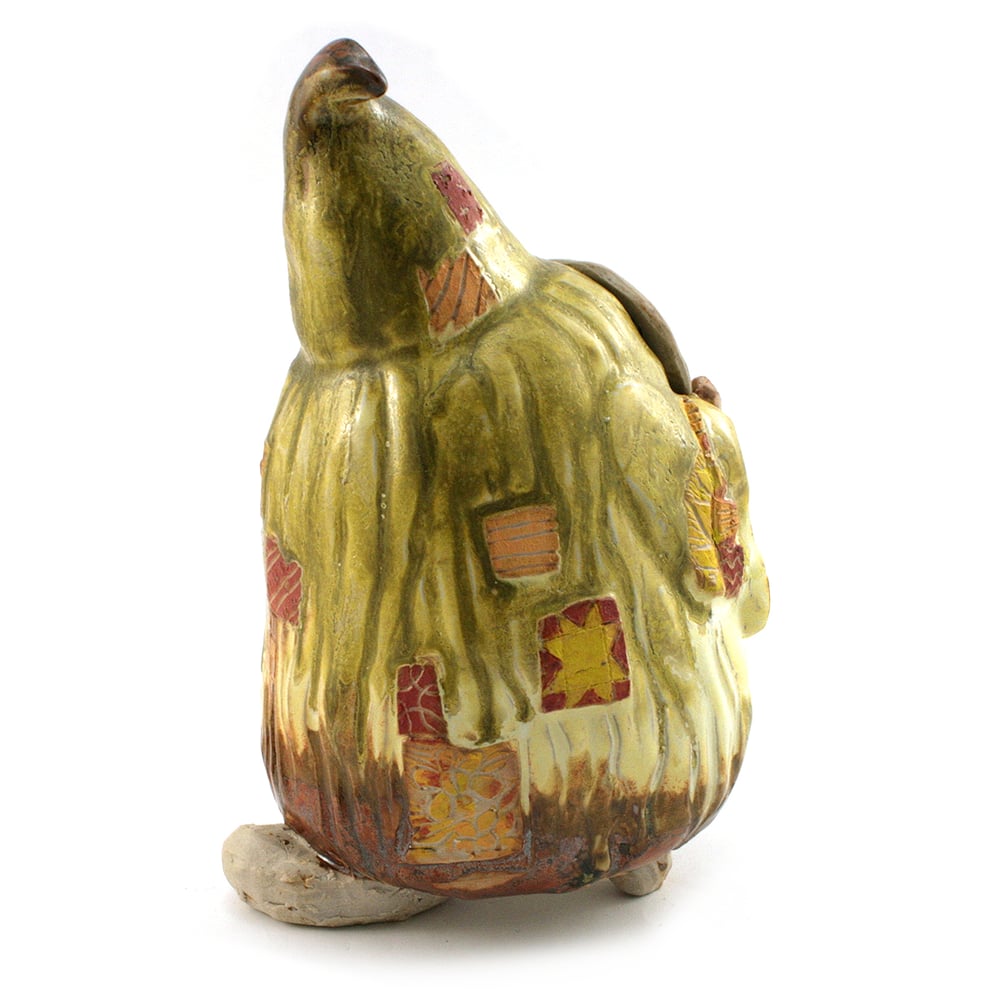 This patchwork wizard features a variety of hand-carved prints in red and orange.