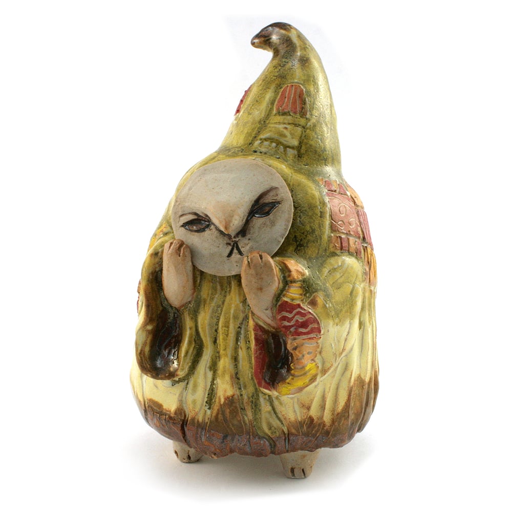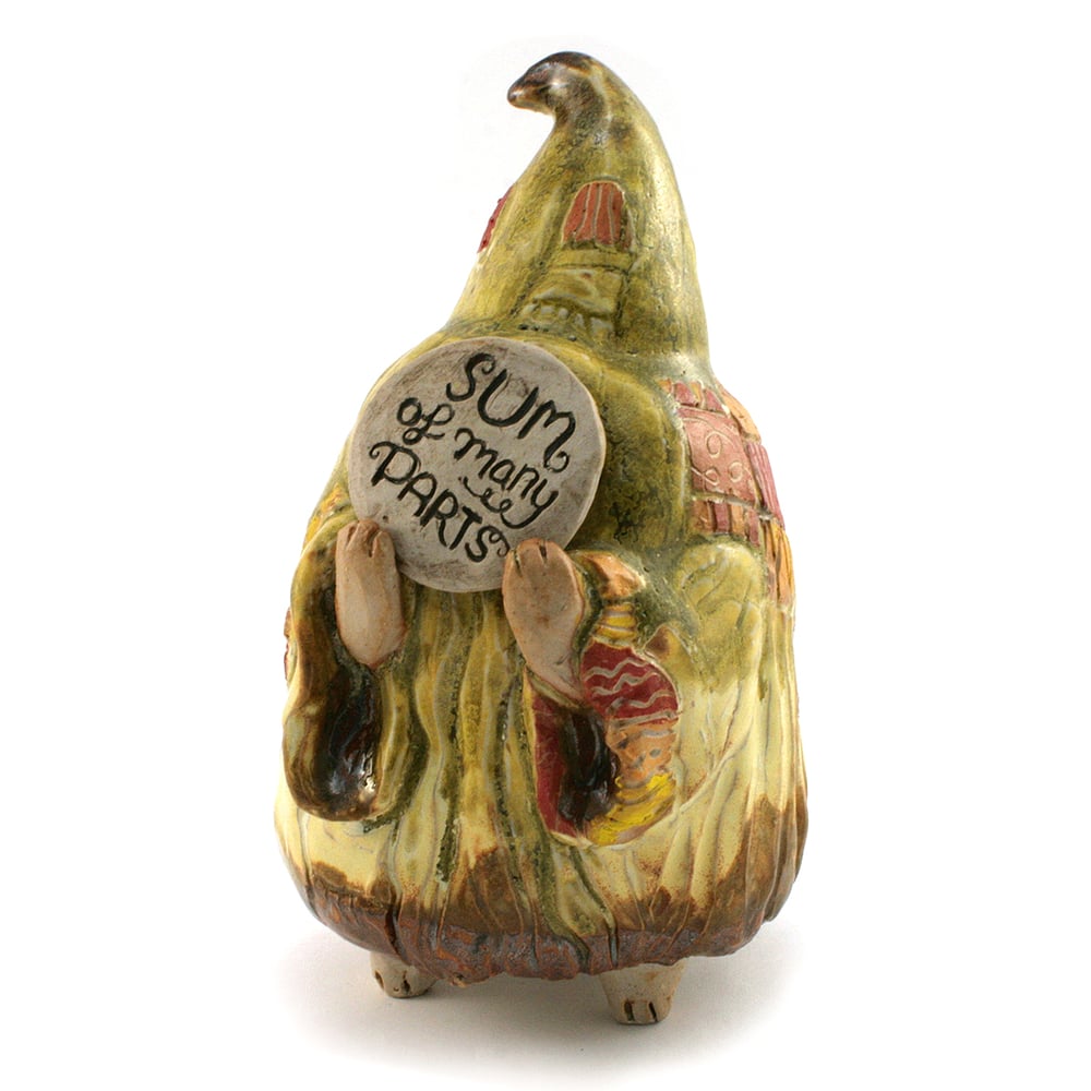 The wizard's face is removable and reversible. One side of the face is somberly humanoid, while the other reads "Sum of Many Parts." The creature is hollow behind its face for storage of tiny objects.
