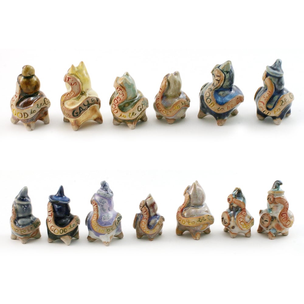 These fellows say "IT'S GOOD TO BE GAY" in little carved rainbow(ish) letters.