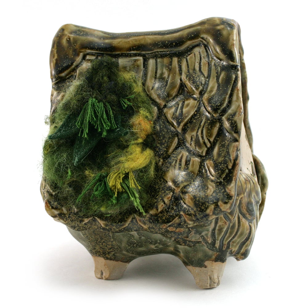 Bedecked with needlefelted wool moss and fronds of cotton embroidery floss.