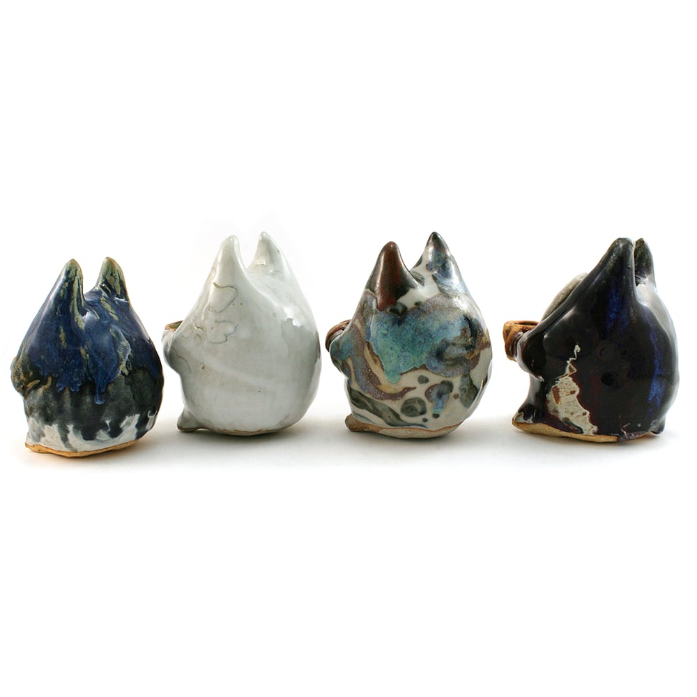 Little round behorned guys with fresh hot mugs of god knows what. Their faces are removable and reversible so that they can "blink" between a closed and open eye. Behind their faces, they are hollow, great for storing tiny objects.