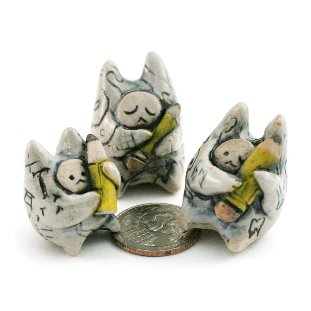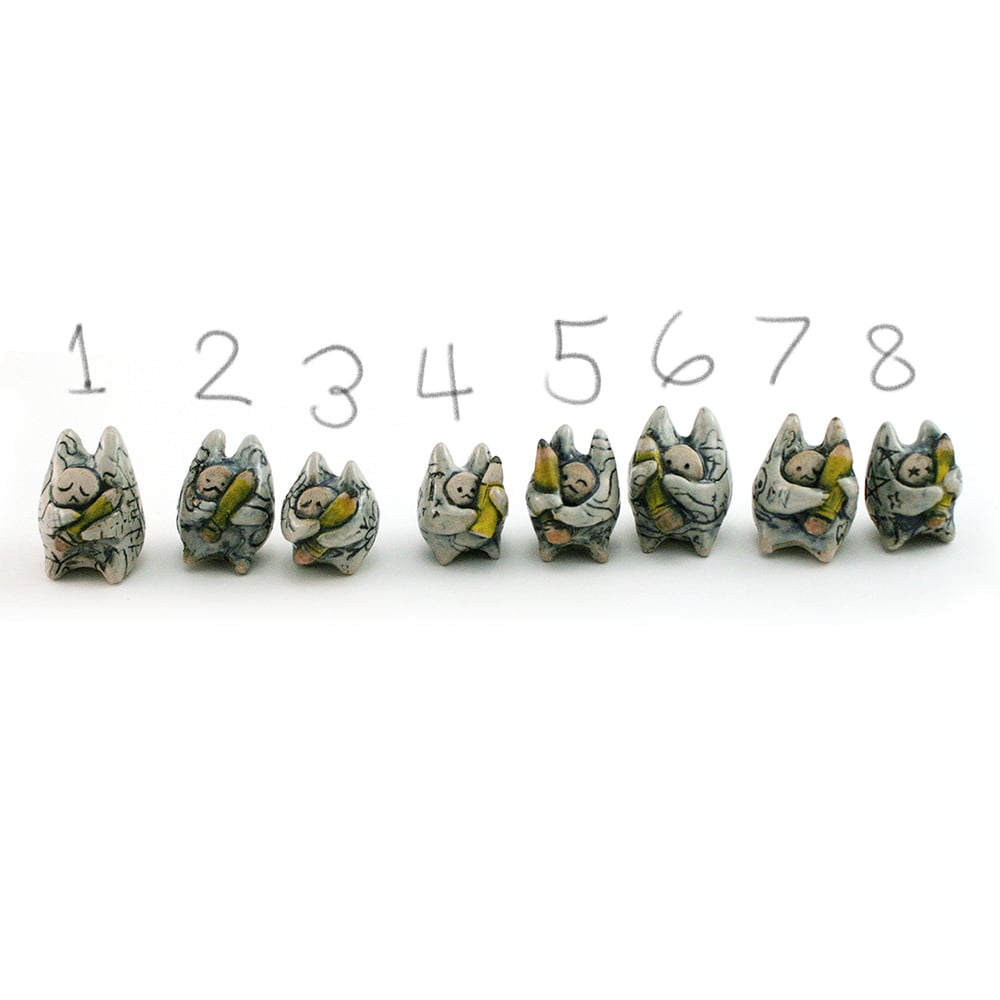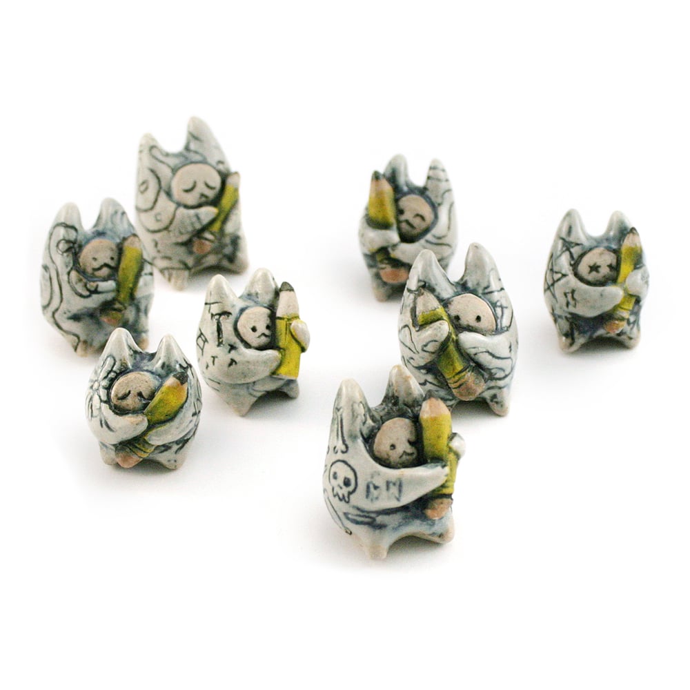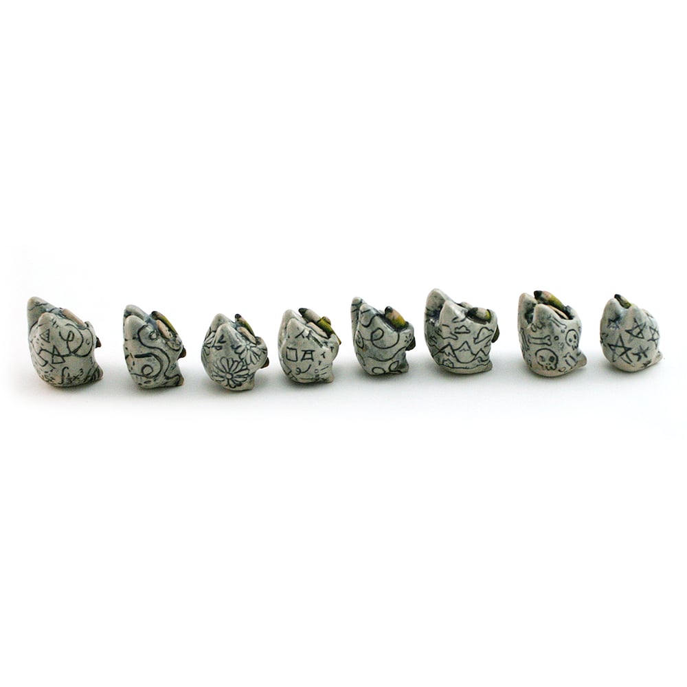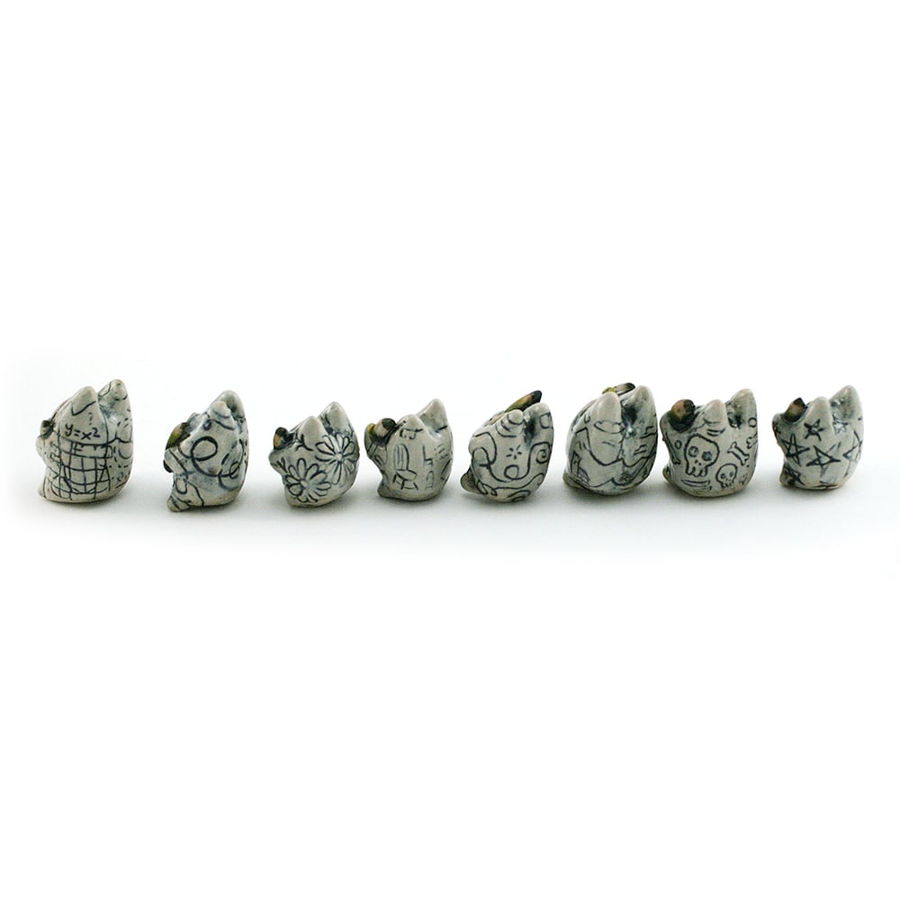 Carved, painted with dark gray underglaze, then dipped in clear glaze, these fellows are excited to scribble.